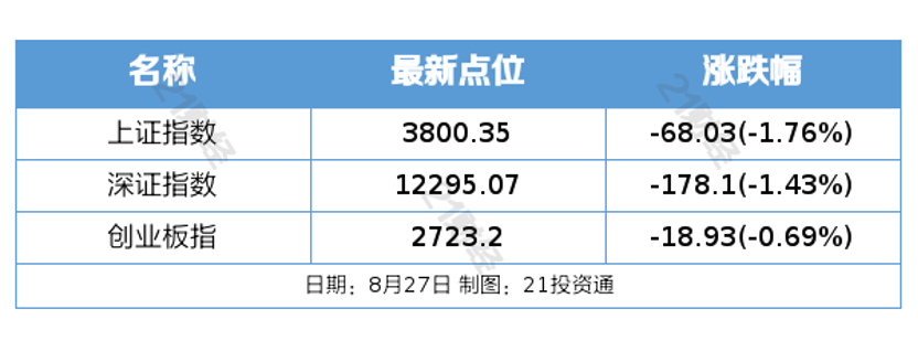 8月27日,A股三大指数今日集体下跌,截至收盘,上证指数跌1.76%,深证成指跌1.43%,创业板指跌0.69%,北证50跌2.6%。沪深京三市全天成交额31978亿元,较上日放量4880亿元。全市场超4700只个股下跌。板块题材上,CPO、稀土永磁、半导体板块表现积极,服装家纺、房地产、白酒、创新药、教育板块跌幅居前。
